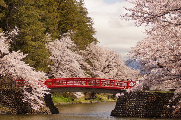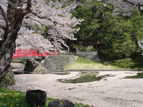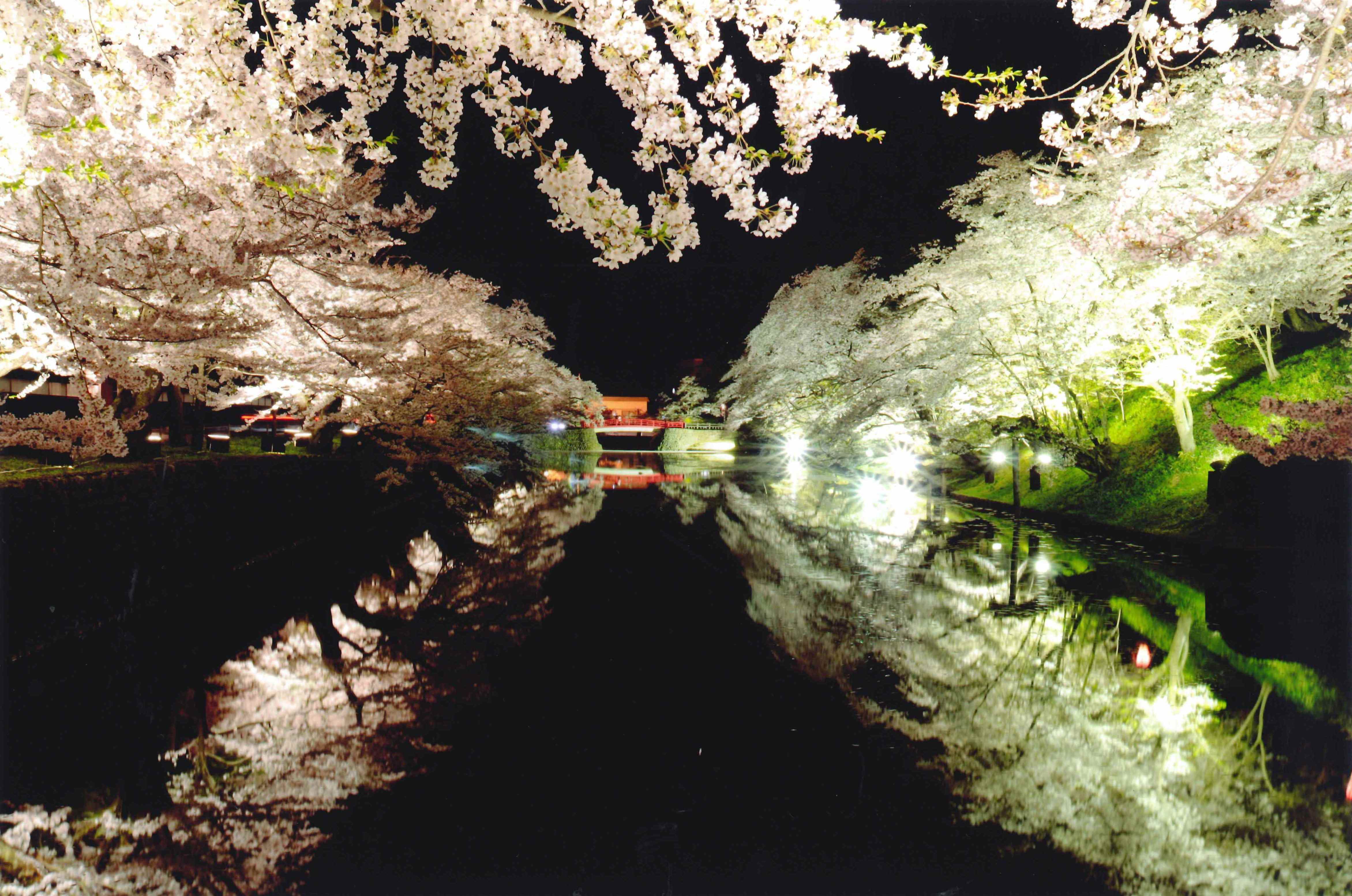写真の撮影された場所は、上杉神社南側で『菱門橋と水面に映る満開の桜』が絶景と評されています。