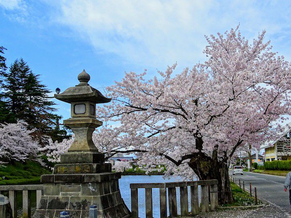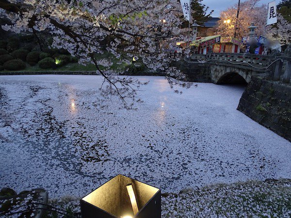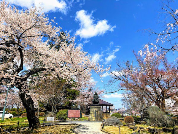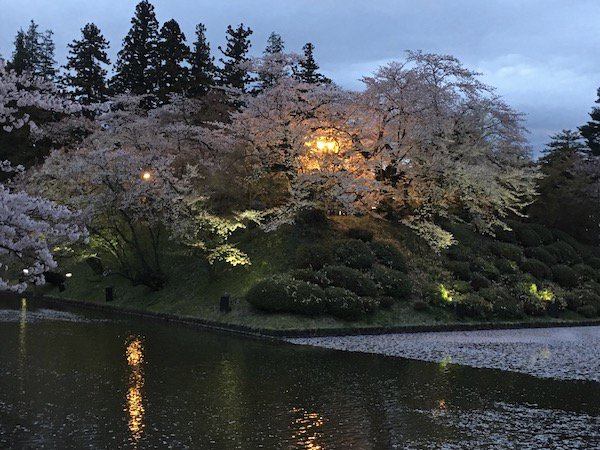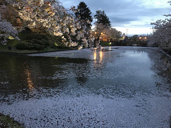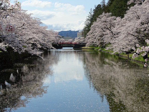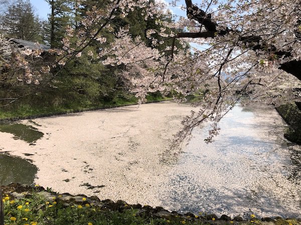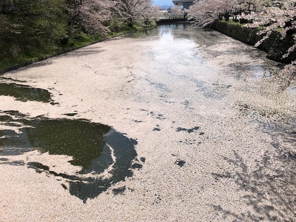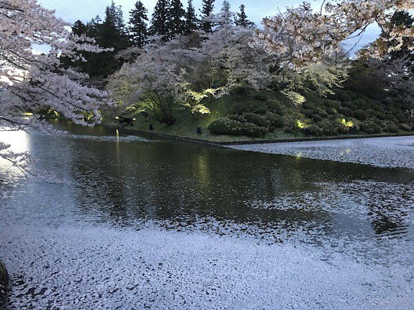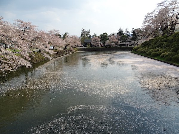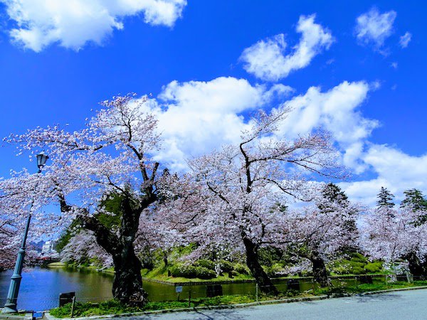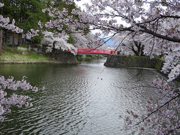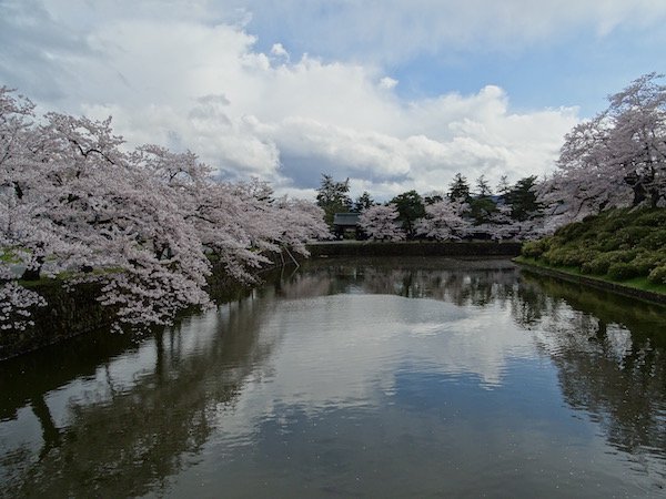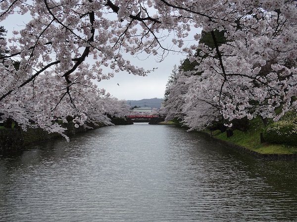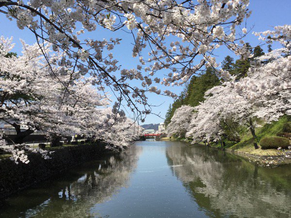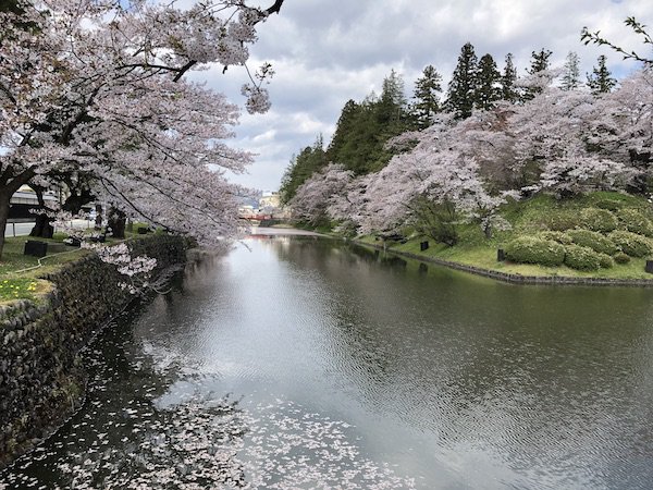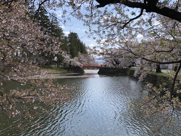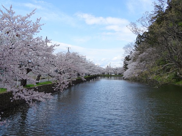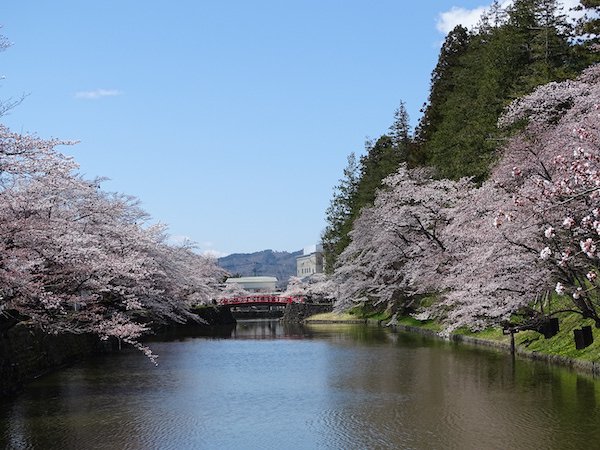 米沢市の松が岬公園の桜も、お堀沿いに200本の桜が咲き誇る様子は
