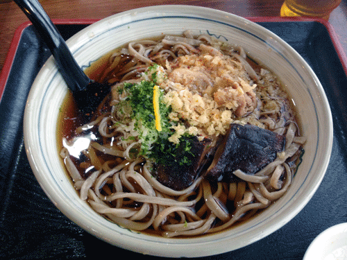 平打ちでのど越しの良いお蕎麦と甘めの冷たいおつゆ天かすと柔らかい大ぶりの鶏肉が豪快にのった特製冷しとりそば。